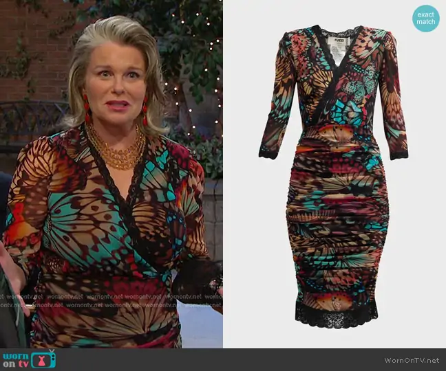Bonnie Lockhart (played by Judi Evans) on Days of our Lives on Peacock was spotted wearing this butterfly print dress on Days of our Lives on Jul 19 2024's episode. Bonnie's Dress is the Butterfly-Print Lace-Trim Tulle Midi Dress by Fuzzi.