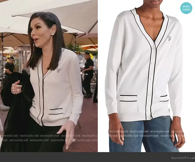Heather Dubrow on The Real Housewives of Orange County on Bravo was spotted wearing this white contrast trim cardigan on The Real Housewives of Orange County on episode 'Rent and Reputations' (18x02) in Jul 2024. Heather's Sweater is the Silk Cardigan by Prada.