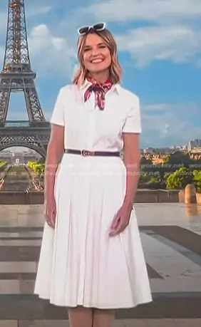 Savannah Guthrie on Today on NBC was spotted wearing this white midi dress and leather belt on Today on Jul 19 2024's episode. Savannah's Dress is the Belted Cotton Blend Shirtdress by Theory . Savannah's Belt is the Reversible Logo-Plaque Belt by Gucci.