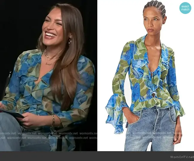 on Access Hollywood on NBC was spotted wearing this blue floral print blouse on Access Hollywood on Jul 19 2024's episode. 's Top is the Alisha Top by Ronny Kobo.