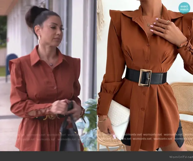 Jennifer Aydin on The Real Housewives of New Jersey on Bravo was spotted wearing this brown lace-up sleeve blouse on The Real Housewives of New Jersey on episode 'Sleepover With One Eye Open' (14x11) in Jul 2024. Jennifer's Top is the Lace-up Cuff Blouse by Lihana . Jennifer's Belt is the La Medusa Wide Leather Belt by Versace.