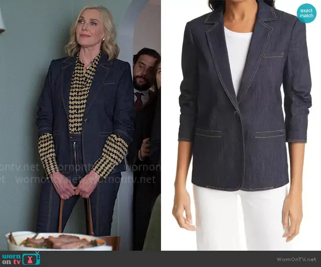 Nadine Gregory (played by Brenda Strong) on UnPrisoned on Hulu was spotted wearing this denim suit and houndstooth blouse on UnPrisoned on episode 'The After-Party' (2x08) in Jul 2024. Nadine's Top is the Houndstooth cady shirt by Victoria Beckham . Nadine's Jacket is the Khloe Denim Blazer in Indigo by Cinq a Sept . Nadine's Pants is the Loren Denim Pants by Cinq a Sept.