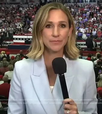 on CBS Evening News on CBS was spotted wearing this Caitlin Huey-Burns’ light blue blazer on CBS Evening News on Jul 22 2024's episode. 's Jacket is the Double Breasted Shoulder Pad Blazer by Zara.