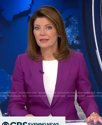 Norah O'Donnell on CBS Evening News on CBS was spotted wearing this purple blazer on CBS Evening News on Jul 22 2024's episode. Norah's Jacket is the Wool and Silk Double-Fabric Blazer by Max Mara.