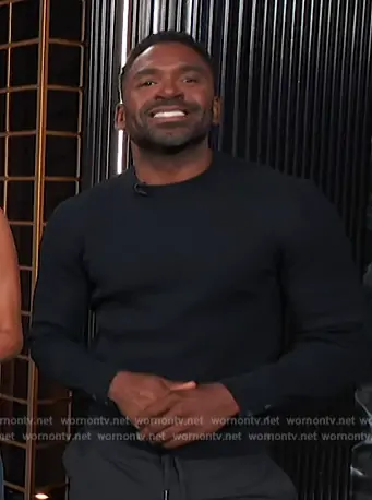 Justin Sylvester on E! News on E! was spotted wearing this black button cuff sweater on E! News on Jul 23 2024's episode. Justin's Sweater is the 4-Bar waffle-knit jumper by Thom Browne.