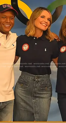 Savannah Guthrie on Today on NBC was spotted wearing this navy polo and denim skirt on Today on Jul 23 2024's episode. Savannah's Top is the custom ordered by Polo Ralph Lauren . Savannah's Skirt is the The Vent-Front Denim Midi-Skirt by Frame.