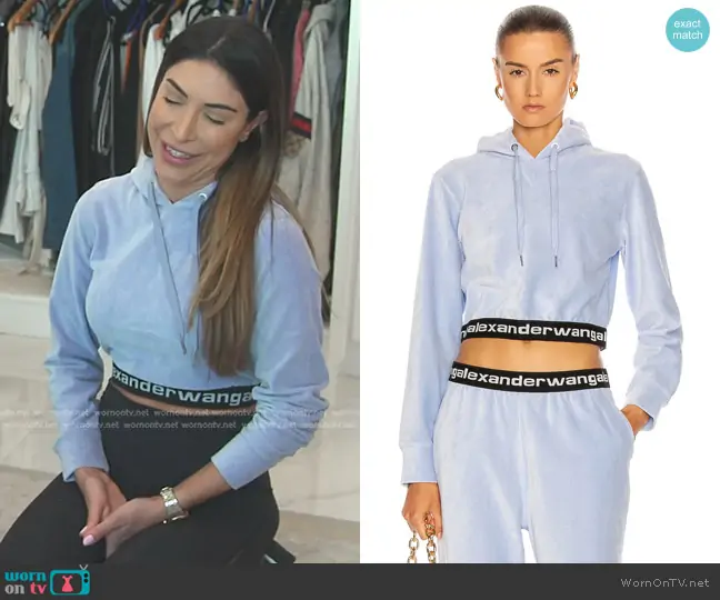 Taleen Marie (played by Taleen Marie) on The Real Housewives of Dubai on BravoTV was spotted wearing this cropped hoodie on The Real Housewives of Dubai on episode 'The Sisterhood of the Traveling Voice Note' (2x08) in Jul 2024. Taleen's Sweater is the Corduroy Logo Elastic Cropped Long Sleeve Hoodie in Xenon Blue by Alexander Wang.