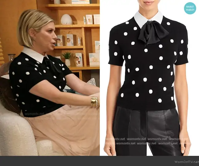Jill Martin on Today on NBC was spotted wearing this black polka dot top on Today on Nov 29 2024's episode. Jill's Top is the Ciara Woven Collar Knit Top by Alice + Olivia.