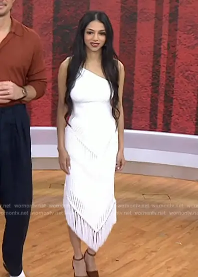 on Today on NBC was spotted wearing this white fringe top and skirt on Today on Jul 24 2024's episode. 's Top is the Trista Top by Cult Gaia . 's Skirt is the Tonisha Skirt by Cult Gaia.