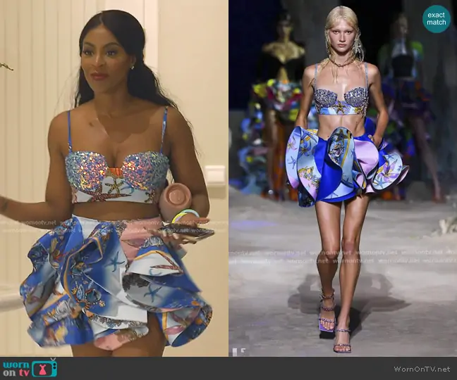 Caroline Brooks (played by Caroline Brooks) on The Real Housewives of Dubai on BravoTV was spotted wearing this starfish print cropped top and mini skirt on The Real Housewives of Dubai on episode 'The Sisterhood of the Traveling Voice Note' (2x08) in Jul 2024. Caroline B's Outfit is the SS 2021 Collection by Versace.