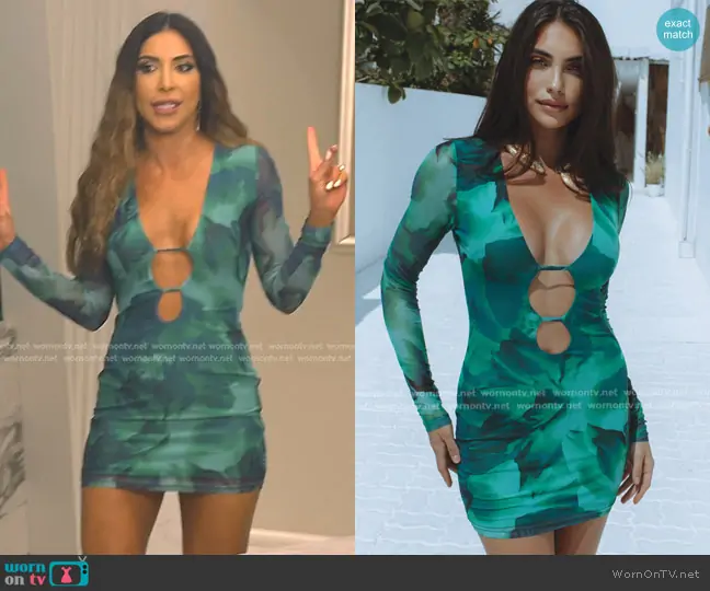 Taleen Marie (played by Taleen Marie) on The Real Housewives of Dubai on BravoTV was spotted wearing this green floral cutout mini dress on The Real Housewives of Dubai on episode 'The Sisterhood of the Traveling Voice Note' (2x08) in Jul 2024. Taleen's Dress is the Kapri Mini Dress in Green Floral by Chic Le Frique.