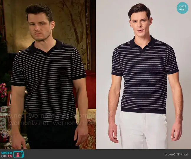 Kyle Abbott (played by Michael Mealor) on The Young and the Restless on CBS was spotted wearing this navy striped polo shirt on The Young and the Restless on Jul 25 2024's episode. Kyle's Shirt is the Navy Knitted Stripe Polo by Hawes & Curtis .