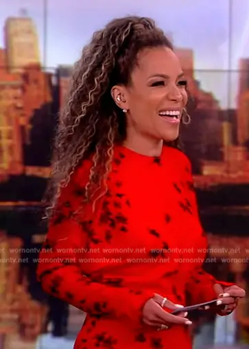 Sunny Hostin on The View on ABC was spotted wearing this red floral print dress on The View on Jul 25 2024's episode. Sunny's Dress is the Floral Long Sleeve Crepe Midi Dress by Victoria Beckham.