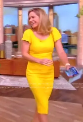 Sara Haines on The View on ABC was spotted wearing this yellow flutter sleeve dress on The View on Jul 25 2024's episode. Sara's Dress is the Yellow Flutter Sleeve Dress by Dolce & Gabbana.