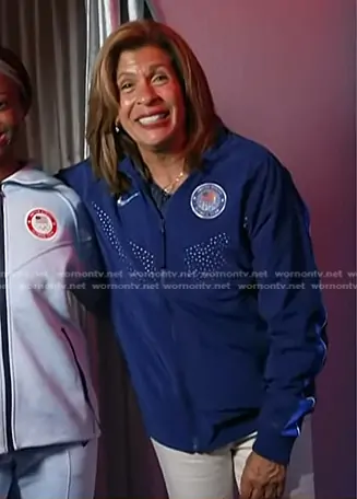 Hoda Kotb on Today on NBC was spotted wearing this blue eyelet track jacket on Today on Jul 25 2024's episode. Hoda's Jacket is the Team USA Podium Jacket in Blue Void by Nike.
