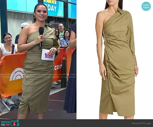 Donna Farizan on Today on NBC was spotted wearing this khaki one-shoulder dress on Today on May 20 2025's episode. Donna's Dress is the Hardin One-Shoulder Midi-Dress in Sage by En Saison.