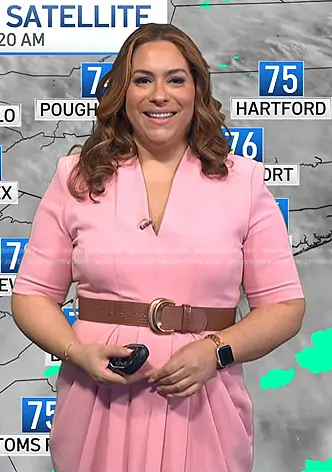 on Today on NBC was spotted wearing this pink belted pleated dress on Today on Jul 25 2024's episode. 's Dress is the V-Neck Belted Short-Sleeve Dress by Donna Karan.