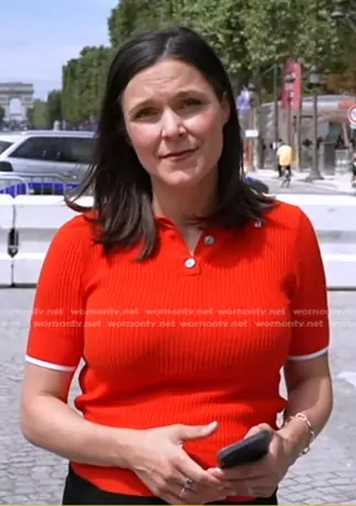Maggie Rulli on Good Morning America on ABC was spotted wearing this red ribbed polo on Good Morning America on Jul 25 2024's episode. Maggie's Top is the Ribbed Polo Sweater by Banana Republic.