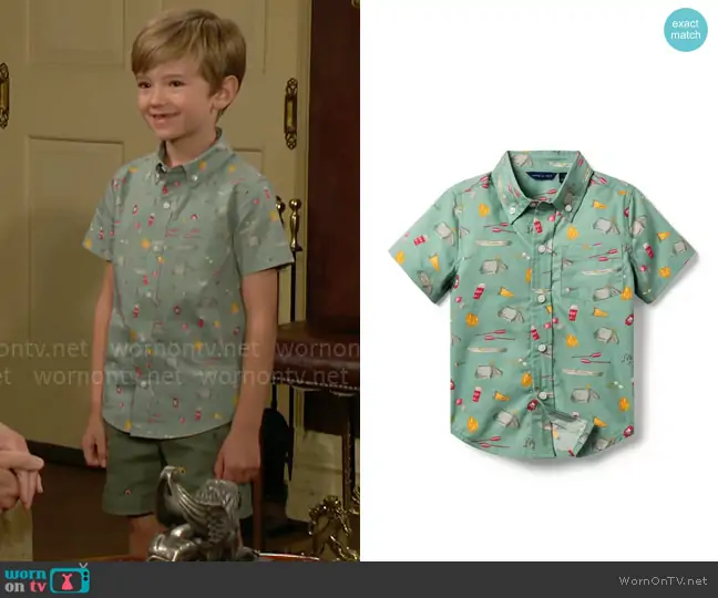 Harrison (played by Redding Munsell) on The Young and the Restless on CBS was spotted wearing this green printed shirt and shorts on The Young and the Restless on Jul 26 2024's episode. 's Shirt is the Linen Cotton Shirt in Pale Green Camp Icon by Janie & Jack . 's Shorts is the Camp Icon Twill Shorts by Janie & Jack.