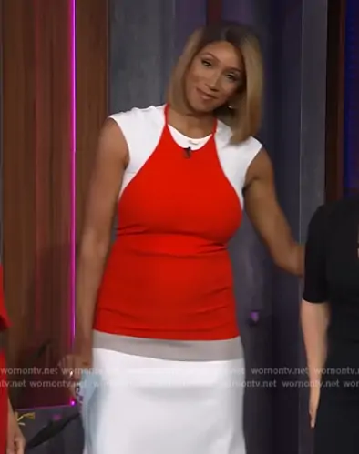 on The Kelly Clarkson Show on NBC was spotted wearing this red and white colorblock dress on The Kelly Clarkson Show on Jul 22 2024's episode. 's Dress is the Short-sleeve layered midi dress by Ferragamo.