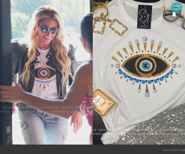 Danielle Cabral on The Real Housewives of New Jersey on Bravo was spotted wearing this eye graphic tee on The Real Housewives of New Jersey on episode 'Don't Trial This at Home' (14x12) in Jul 2024. Danielle's Top is the See No Evil Tshirt by New Generation.