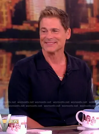 on The View on ABC was spotted wearing this navy pinstripe shirt on The View on Jul 29 2024's episode. 's Shirt is the Shark-collar Shirt in Matte and Shiny Striped Silk by Saint Laurent.