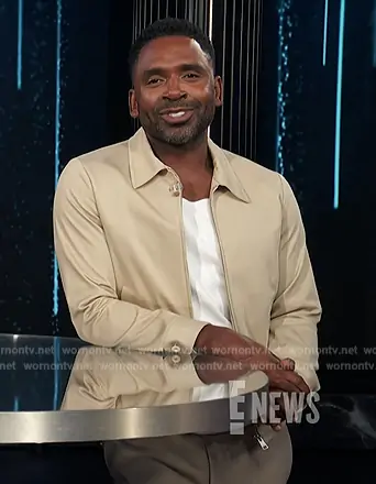 Justin Sylvester on E! News on E! was spotted wearing this beige zip front jacket on E! News on Jul 29 2024's episode. Justin's Jacket is the Twill shirt jacket by Sandro.