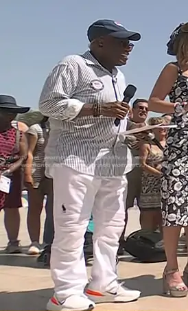 on Today on NBC was spotted wearing this striped shirt and white jeans on Today on Jul 31 2024's episode. 's Shirt is the Team USA Opening Ceremony Oxford Shirt by Polo Ralph Lauren . 's Pants is the Team USA Closing Ceremony Parkside Jeans by Polo Ralph Lauren . 's Shoes is the Invincible 3 Road Running Shoes in Blueprint by Nike.