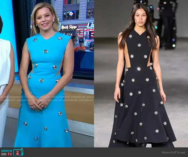 on Good Morning America on ABC was spotted wearing this blue cutout embellished dress on Good Morning America on Jul 30 2024's episode. 's Dress is the Fall 2024 Collection by David Koma . 's Shoes is the I Love Vivier Embellished-Heel Metallic Leather Sandals by Roger Vivier.