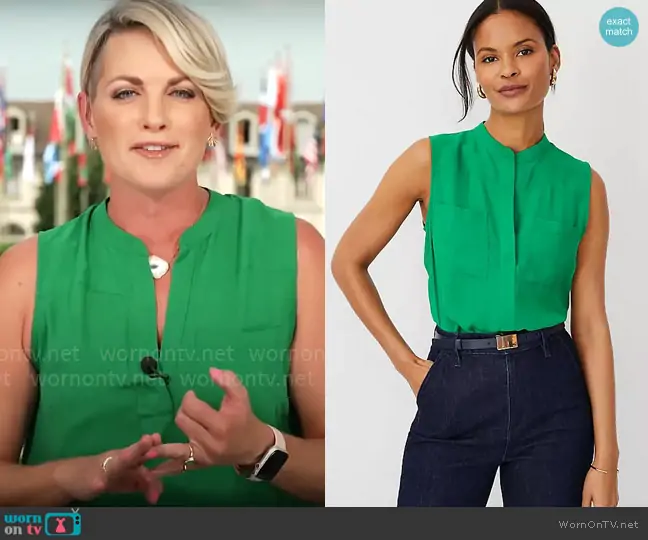Jamie Yuccas on CBS Mornings on CBS was spotted wearing this Jamie Yuccas’green sleeveless top on CBS Mornings on Jul 31 2024's episode. Jamie's Top is the Sleeveless Camp Shirt in Grass Green by Ann Taylor .