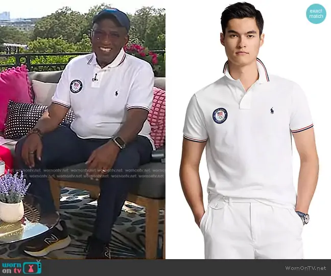 on Today on NBC was spotted wearing this white polo shirt and black sneakers on Today on Aug 01 2024's episode. 's Shirt is the Team USA Custom Slim Fit Polo Shirt by Polo Ralph Lauren . 's Shoes is the Fresh Foam X 1080 V12 Running Shoe by New Balance.