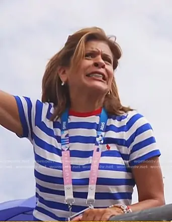 Hoda Kotb on Today on NBC was spotted wearing this blue striped tee on Today on Aug 01 2024's episode. Hoda's Top is the Team USA Striped Jersey Tee in Sapphire /Ceramic White by Polo Ralph Lauren.