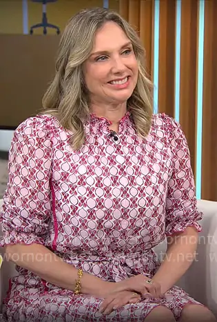 on CBS Mornings on CBS was spotted wearing this geometric print dress on CBS Mornings on Aug 02 2024's episode. 's Dress is the Silk Cotton Summer Brocade Swing Dress + Belt by Me + Em .