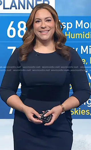 on Today on NBC was spotted wearing this Violeta Yas’ navy velvet panel sheath dress on Today on Aug 02 2024's episode. 's Dress is the Velvet Panel Scuba Crepe Sheath Dress in Navy by Vince Camuto.