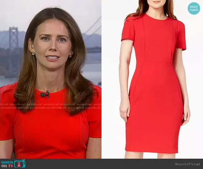 on NBC News Daily on NBC was spotted wearing this red short sleeve dress on NBC News Daily on Aug 02 2024's episode. 's Dress is the Seamed Scuba Crepe Sheath Dress by Calvin Klein.