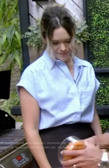 on Live with Kelly and Mark on Disney ABC Home Entertainment was spotted wearing this blue check shirt on Live with Kelly and Mark on Aug 02 2024's episode. 's Top is the Hilltop in Blue Seersucker Gingham by Madewell.