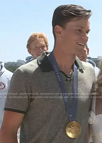 on Today on NBC was spotted wearing this dark green striped knit polo on Today on Aug 05 2024's episode. 's Shirt is the Liam Sweater Polo in Olive/Driftwood by Marine Layer.