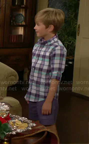 Harrison Abbott (played by Redding Munsell) on The Young and the Restless on CBS was spotted wearing this plaid button down shirt on The Young and the Restless on Aug 05 2024's episode. 's Shirt is the The Madras Plaid Shirt in Dark Blue Plaid by Janie + Jack.