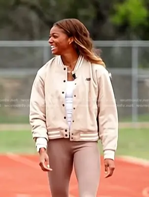 on NBC News Daily on NBC was spotted wearing this beige varsity jacket on NBC News Daily on Aug 05 2024's episode. 's Jacket is the Sydney's Signature Collection x NB Interlock Jacket in Stoneware by New Balance.