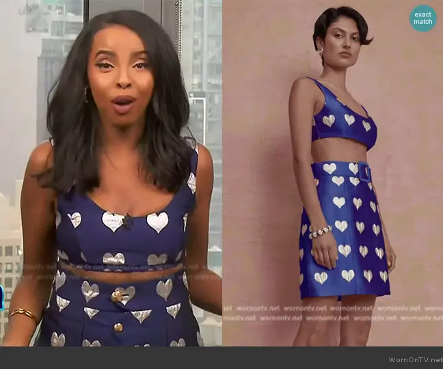 Mona Kosar Abdi on Extra on Extra was spotted wearing this blue metallic heart top and skirt on Extra on Jul 05 2024's episode. Mona's Top is the Sidney Blue Heart Silk Jacquard Bralette by Lisou . Mona's Skirt is the Frankie Heart Jacquard Skirt by Lisou.