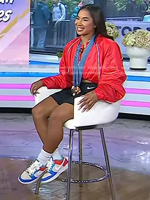 on Today on NBC was spotted wearing this Jordan Chiles’ red jacket and black pleated mini skirt on Today on Aug 16 2024's episode. 's Jacket is the NRG Striped Shell Track Jacket in University Red by Nike x Jacquemus . 's Skirt is the Court Dri-FIT Advantage Pleated Tennis Skirt by Nike . 's Shoes is the Dunk Low Retro PRM Year of the Rabbit Sneakers in Blue/Orange/Cream by Nike.
