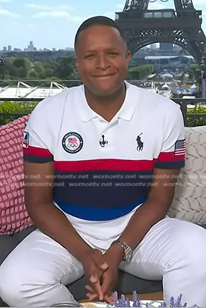 Craig Melvin on Today on NBC was spotted wearing this white colorblock polo shirt on Today on Aug 08 2024's episode. Craig's Shirt is the Team USA Custom Slim Fit Polo Shirt in White Multi by Polo Ralph Lauren.