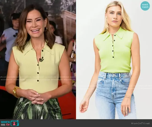 Rebecca Jarvis on Good Morning America on ABC was spotted wearing this yellow top and green printed skirt on Good Morning America on May 07 2025's episode. Rebecca's Top is the Taylor Top by A.L.C. . Rebecca's Skirt is the Kalliope Skirt by Altuzarra . Rebecca's Shoes is the Suede Web Sneakers by Gucci.