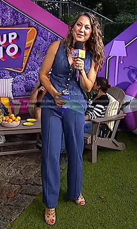 Ginger Zee on Good Morning America on ABC was spotted wearing this denim vest and jeans on Good Morning America on Aug 09 2024's episode. Ginger's Vest is the Denim Vest by Rosetta Getty Collective . Ginger's Pants is the Denim Trousers by Rosetta Getty Collective.