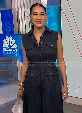Morgan Radford on NBC News Daily on NBC was spotted wearing this denim snap button maxi dress on NBC News Daily on Aug 09 2024's episode.