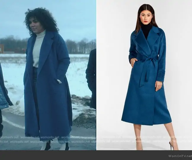 Allison Hargreeves (played by Emmy Raver-Lampman) on The Umbrella Academy on Netflix was spotted wearing this blue alpaca wrap coat on The Umbrella Academy on episode 'Jean and Gene' (4x2) in Aug 2024. Allison's Coat is the Baby Alpaca Long Notched Collar Wrap Coat by Sentaler.