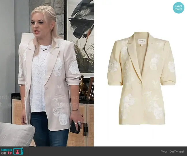 Maxie Jones (played by Kirsten Storms) on General Hospital on ABC was spotted wearing this beige floral embroidered blazer on General Hospital on Sep 12 2024's episode. Maxie's Jacket is the Khloe Floating Roses Blazer by Cinq a Sept .