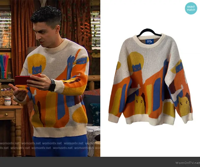 Parker Preston (played by Trevor Tordjman) on Bunkd on Disney was spotted wearing this geometric print sweater on Bunkd on episode 'Slapshot to the Heart' (7x21) in Aug 2024. Parker's Sweater is the Geometric Patterned Knit Sweater by Aelfric Eden.