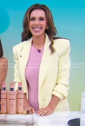 on Good Morning America on ABC was spotted wearing this yellow ruched sleve blazer on Good Morning America on Aug 13 2024's episode.
