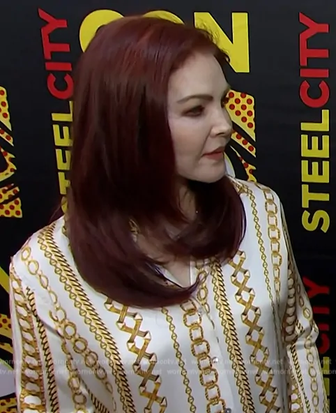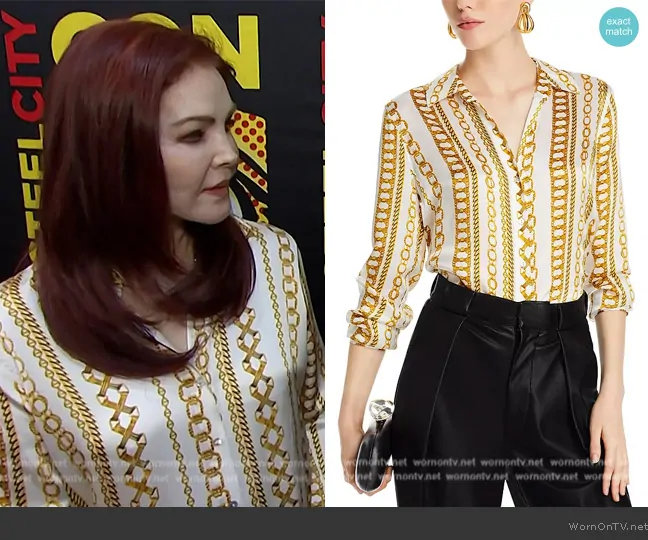 on E! News on E! was spotted wearing this chain print blouse on E! News on Aug 13 2024's episode. 's Top is the Tyler Printed Silk Long Sleeve Shirt by L'Agence.